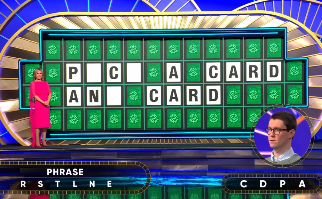 Joined by his fiancée Courtney, Ralph chose the category “Phrase.” With the standard R, S, T, L, N, and E revealed, he added C, D, P, and A. The puzzle board displayed: “P_C_ A CARD AN_ CARD.”